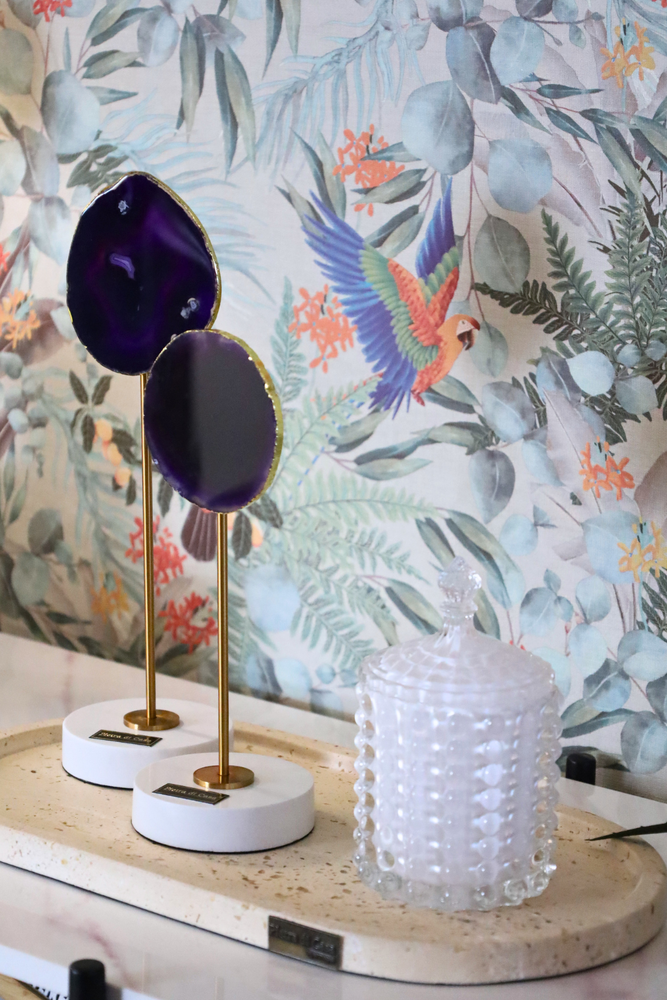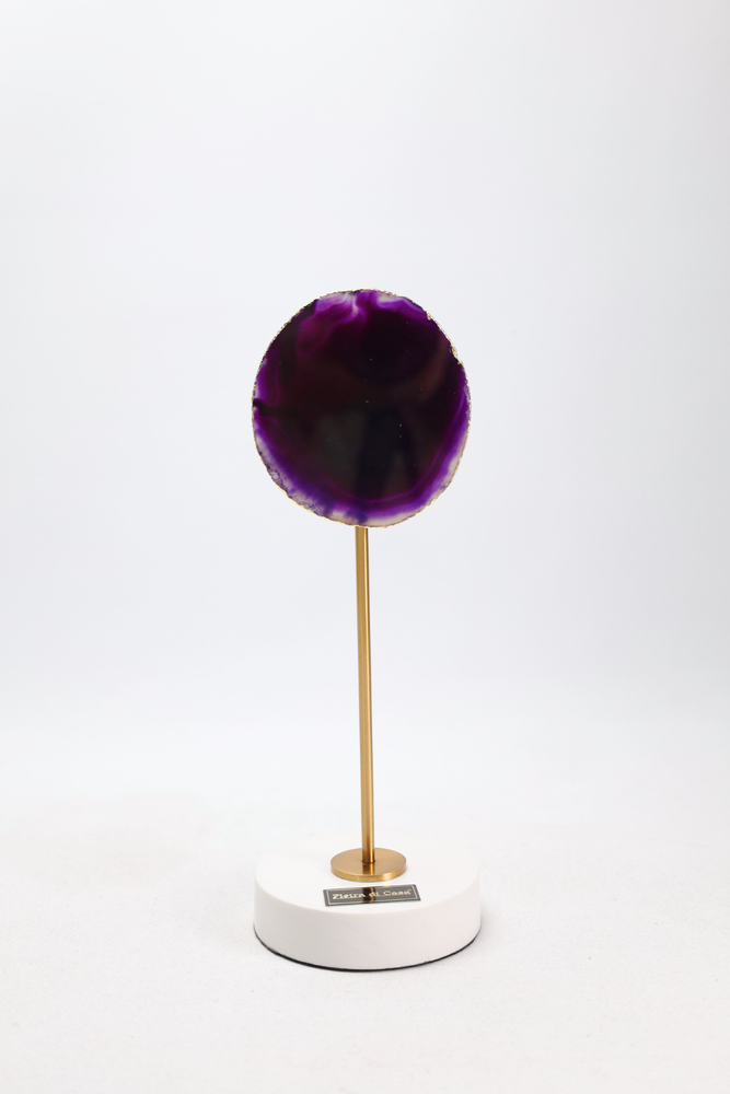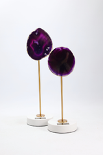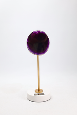 Cada peça é composta por uma ágata roxa natural em tamanho S ou M, montada sobre uma base redonda em mármore Calacatta e sustentada por uma haste em latão, criando um contraste harmonioso entre materiais nobres e design contemporâneo.