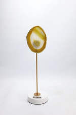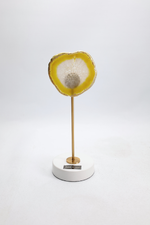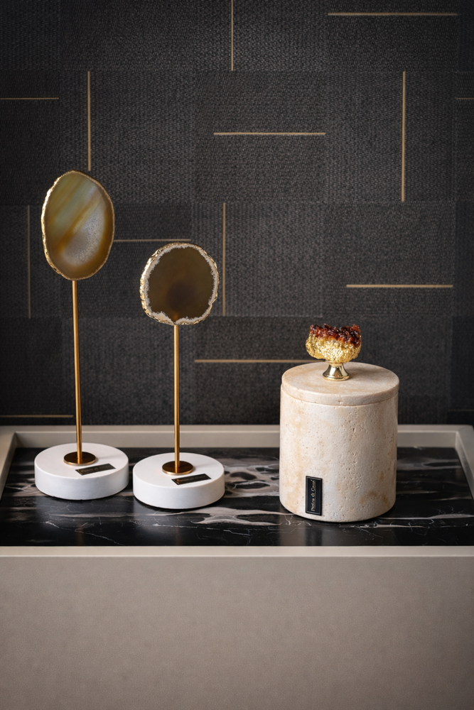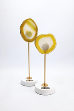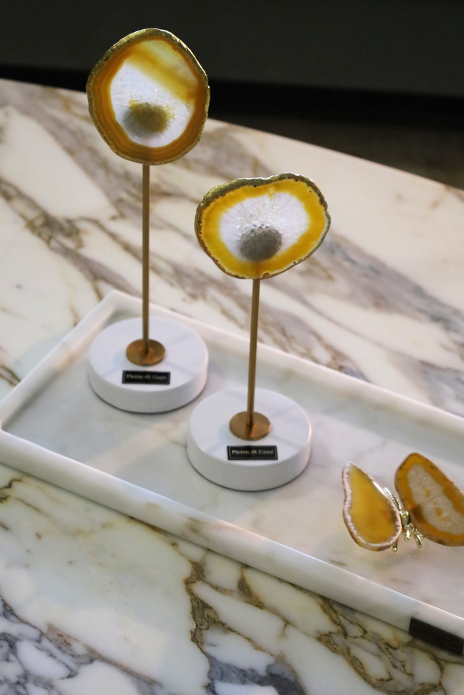 Cada peça é composta por uma ágata amarela natural em tamanho S ou M, montada sobre uma base redonda em mármore Calacatta e sustentada por uma haste em latão, criando um contraste harmonioso entre materiais nobres e design contemporâneo.