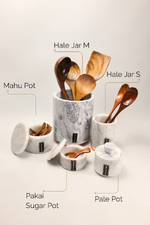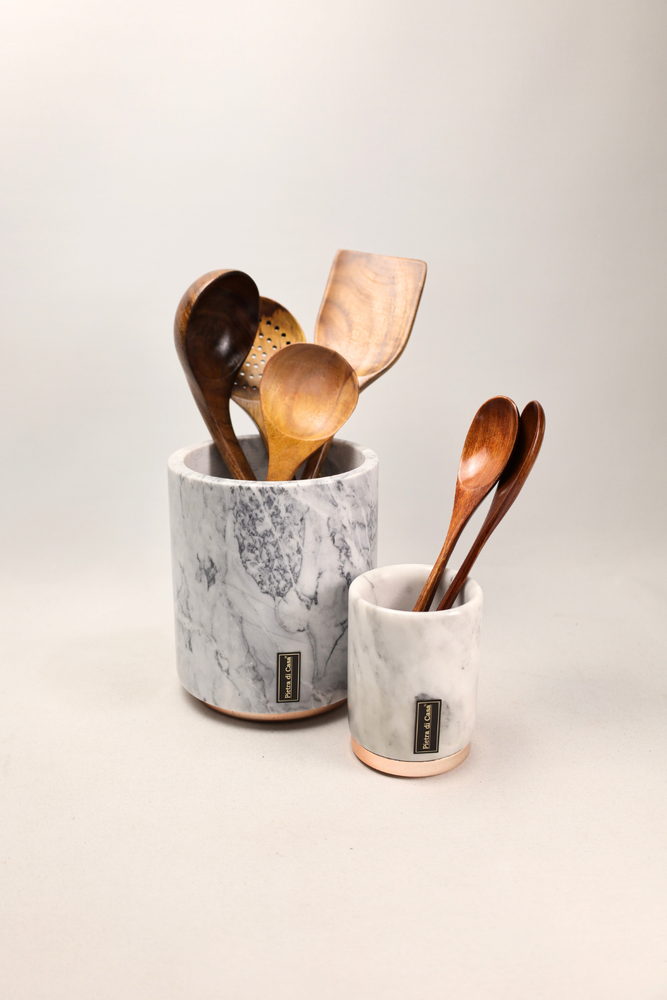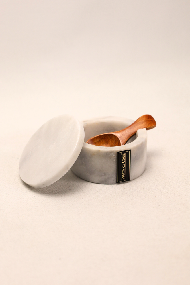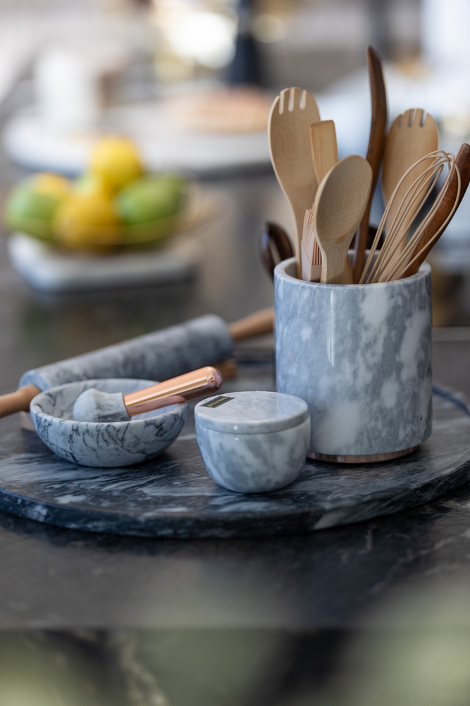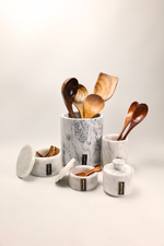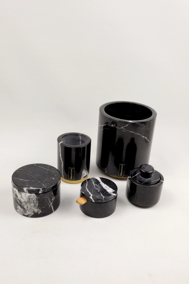 Desenhado e produzido em pequenos lotes, cada pote e frasco é trabalhado manualmente em pedra natural, garantindo subtis variações de veios e tonalidades que reforçam a singularidade de cada peça. Ideal para organizar essenciais de cozinha ou para decorar prateleiras, aparadores e bancadas com um toque de luxo discreto.