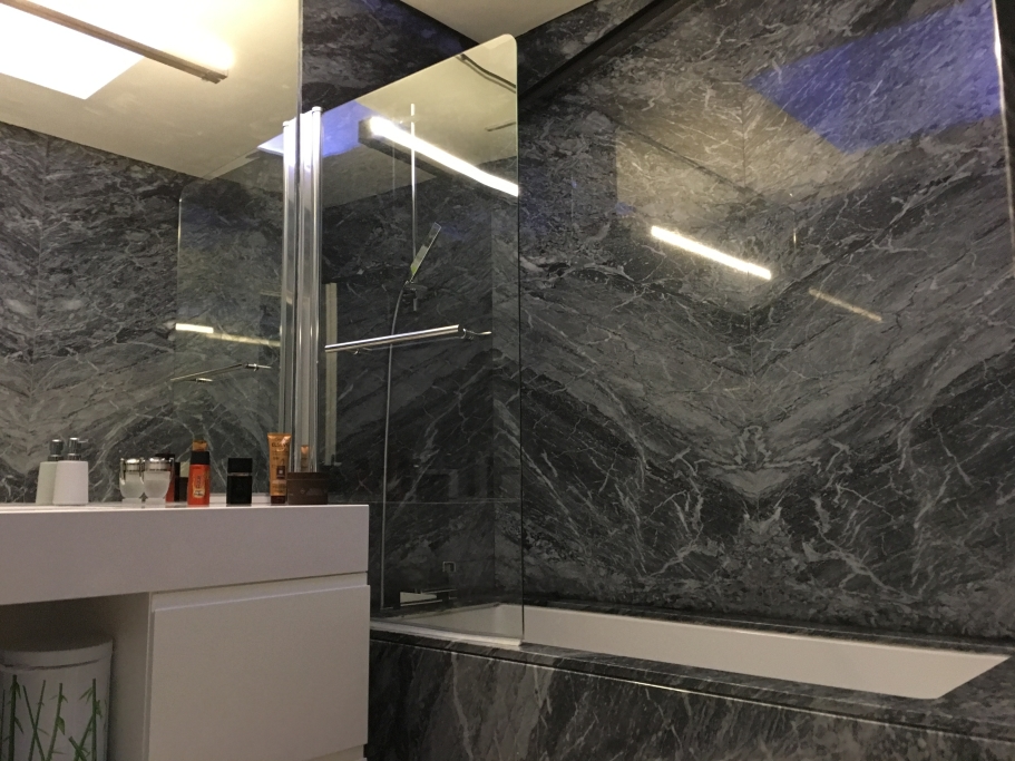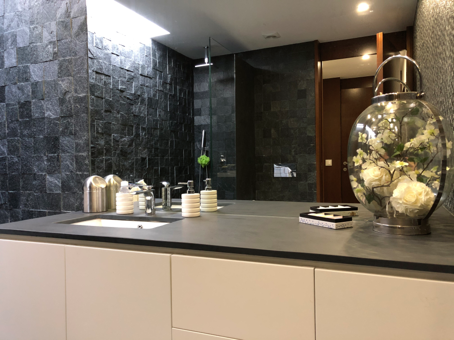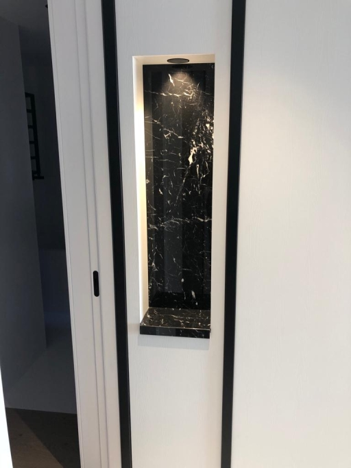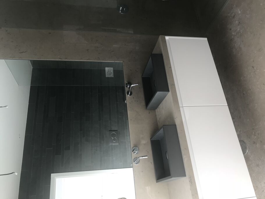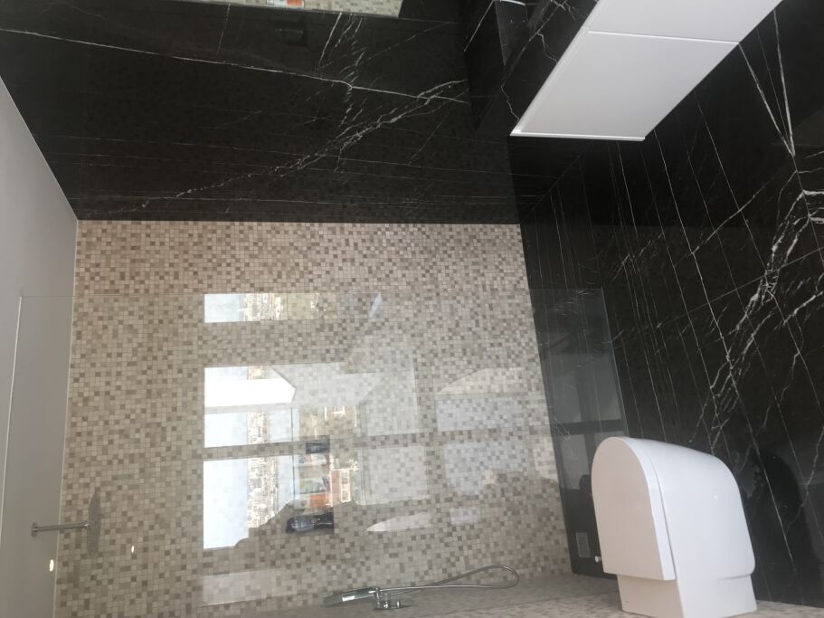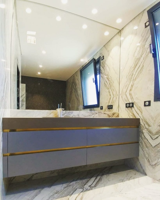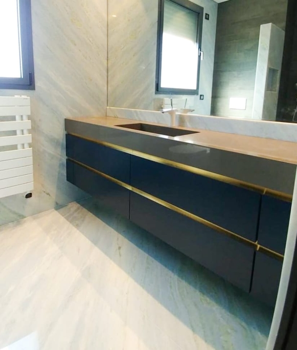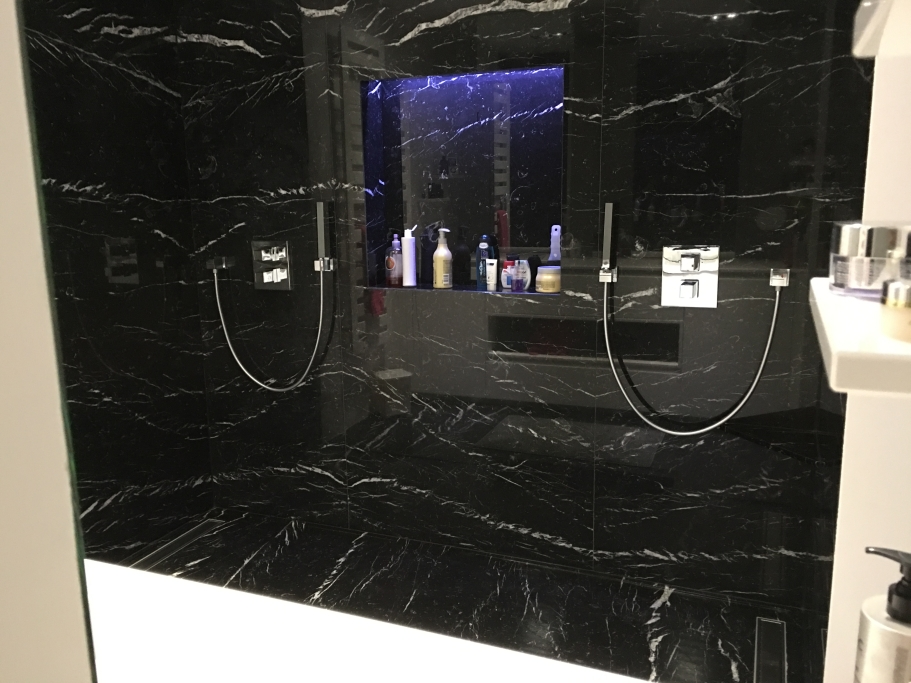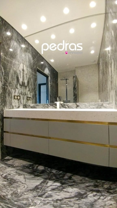 Logement de luxe. avec Fourniture et Application de Quartzite Noir sur les Façades ; Marbre Blanc Neige pour Murs et Sols de Salle de Bain, avec Base de Douche modèle PURE byannopei et Lavabo modèle VAT Double XXL par annopei; Lavabo chez IS Service en modèle Onyx GROOVES byannopei.