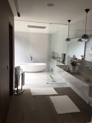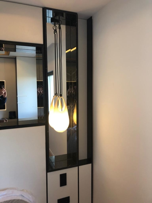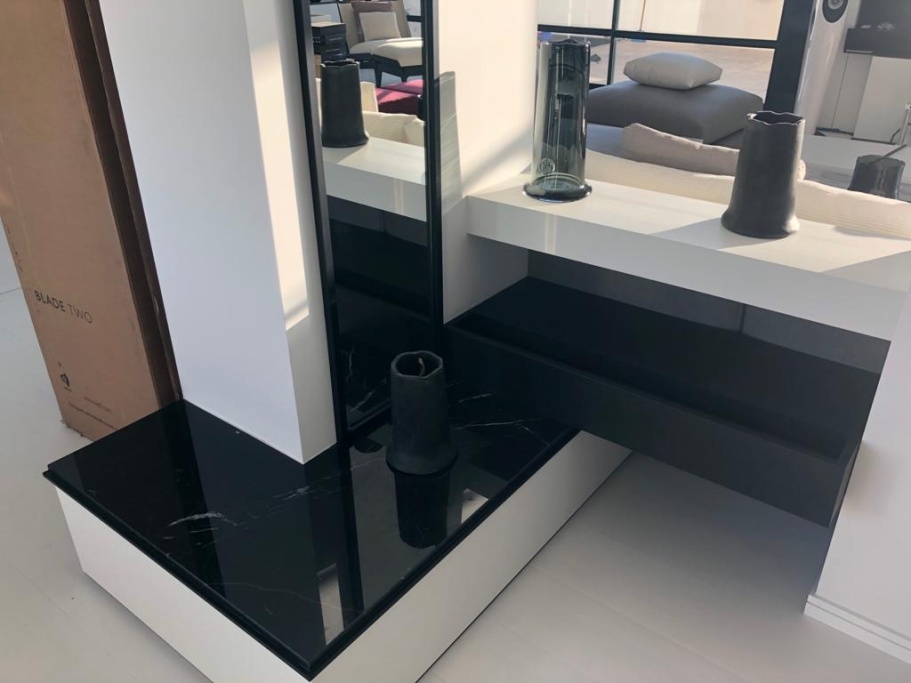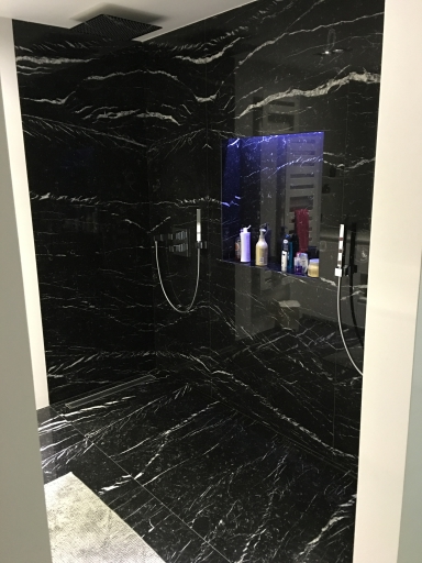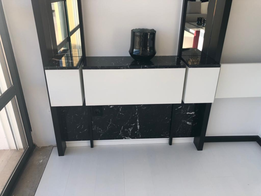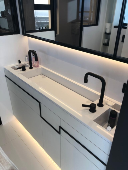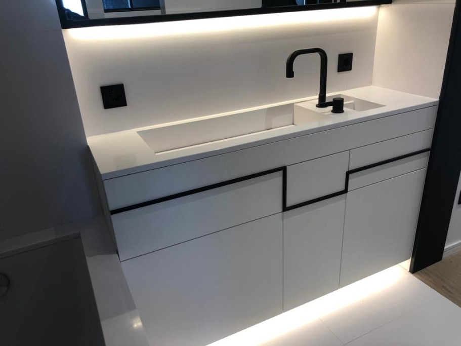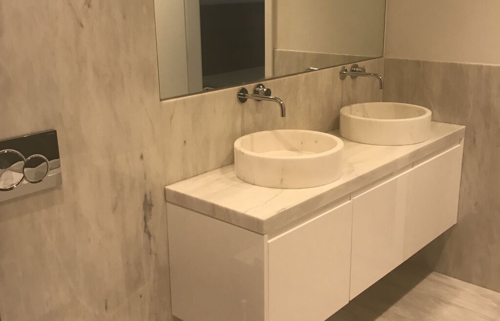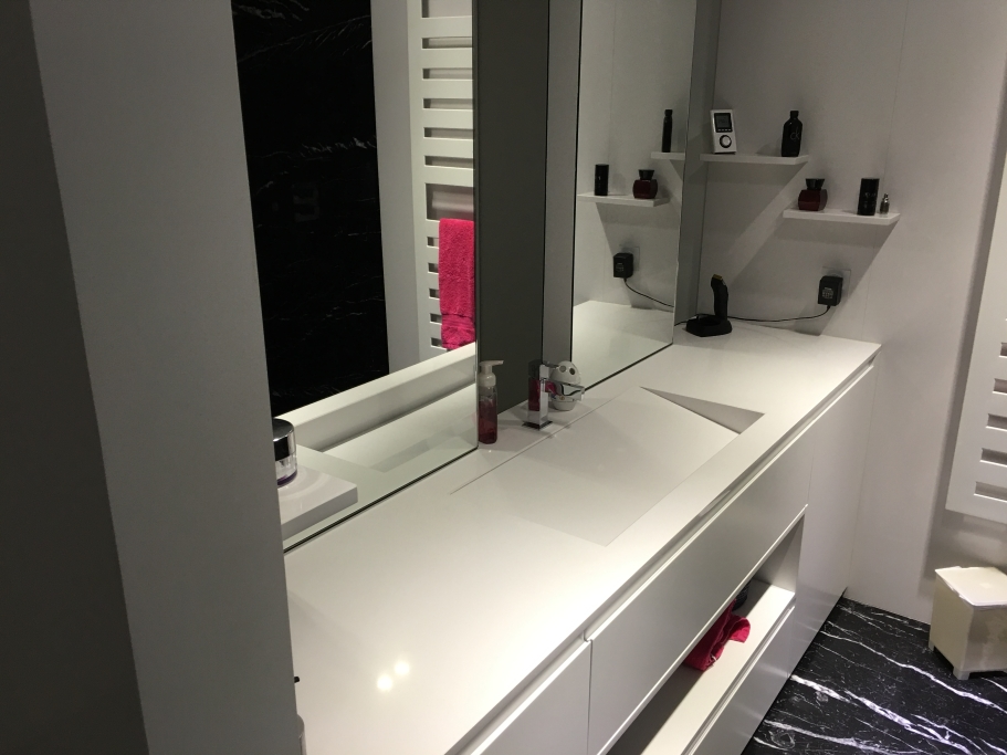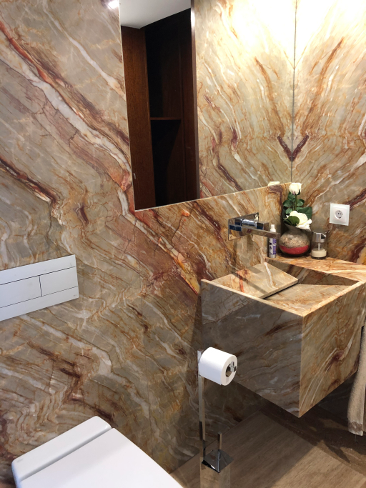 Logement de luxe. avec Fourniture et Application de Quartzite Noir sur les Façades ; Marbre Blanc Neige pour Murs et Sols de Salle de Bain, avec Base de Douche modèle PURE byannopei et Lavabo modèle VAT Double XXL par annopei; Lavabo chez IS Service en modèle Onyx GROOVES byannopei.