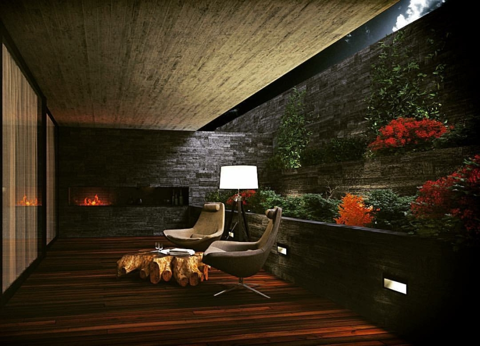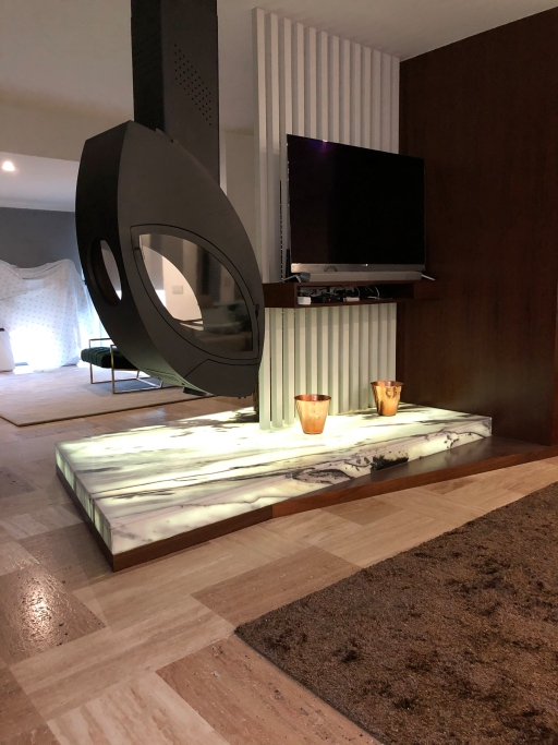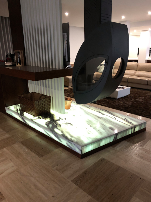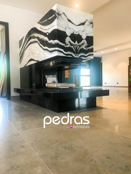 Fourniture et application de travertin pour les sols des maisons et les bordures des piscines intérieures ; Marbre blanc Panda avec système de rétroéclairage pour la base du foyer ; Quartzite nacré pour Service IS et avec lavabo modèle WALL CUBE byannopei; EST en travertin ; EST en quartzite noir.