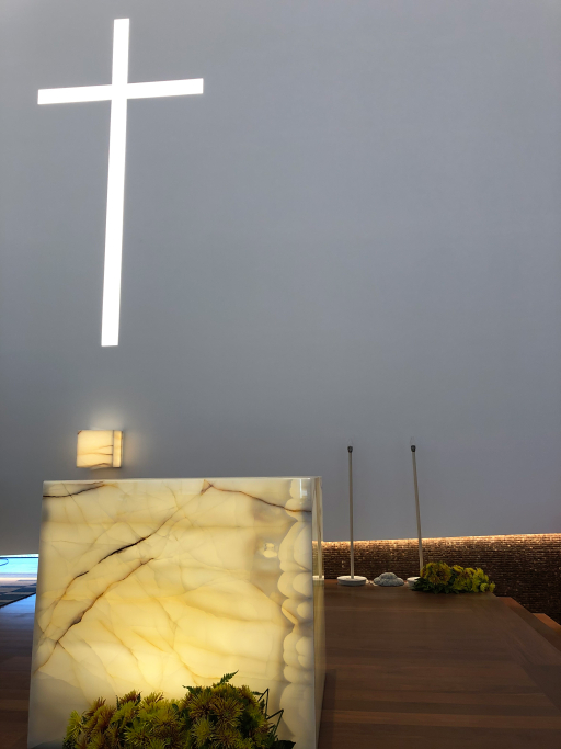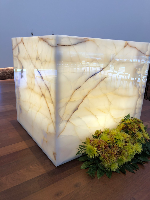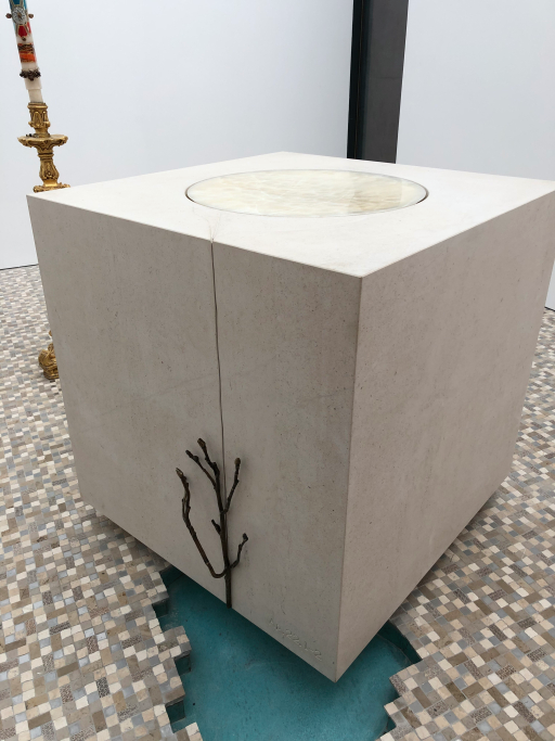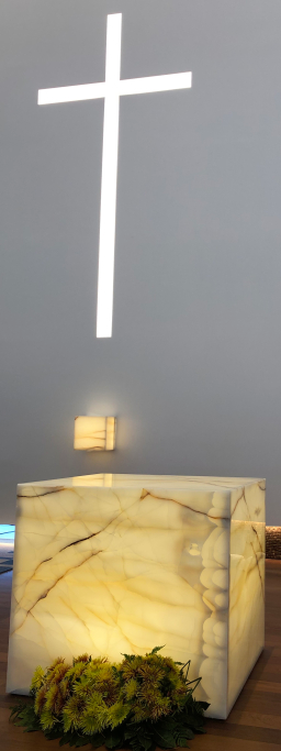 Fourniture et Montage d'Autel et Tabernacle en Onyx Blanc rétro-éclairé ; Fonts baptismaux en bloc de calcaire solide. Il comprenait toute la fourniture et le montage du système de remontée d'eau et des détails décoratifs en laiton pour les fonts baptismaux et tout le rétroéclairage à LED pour l'autel.