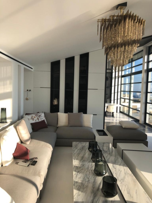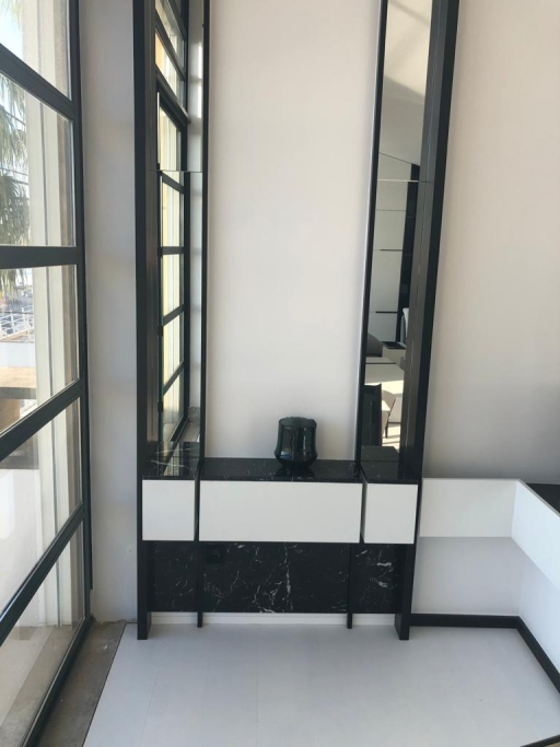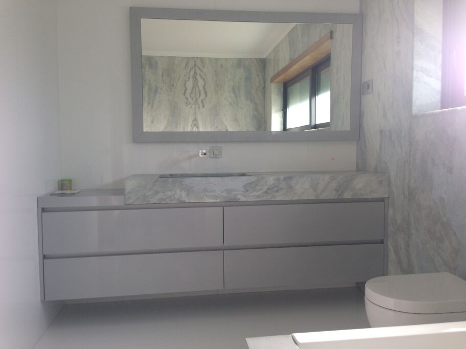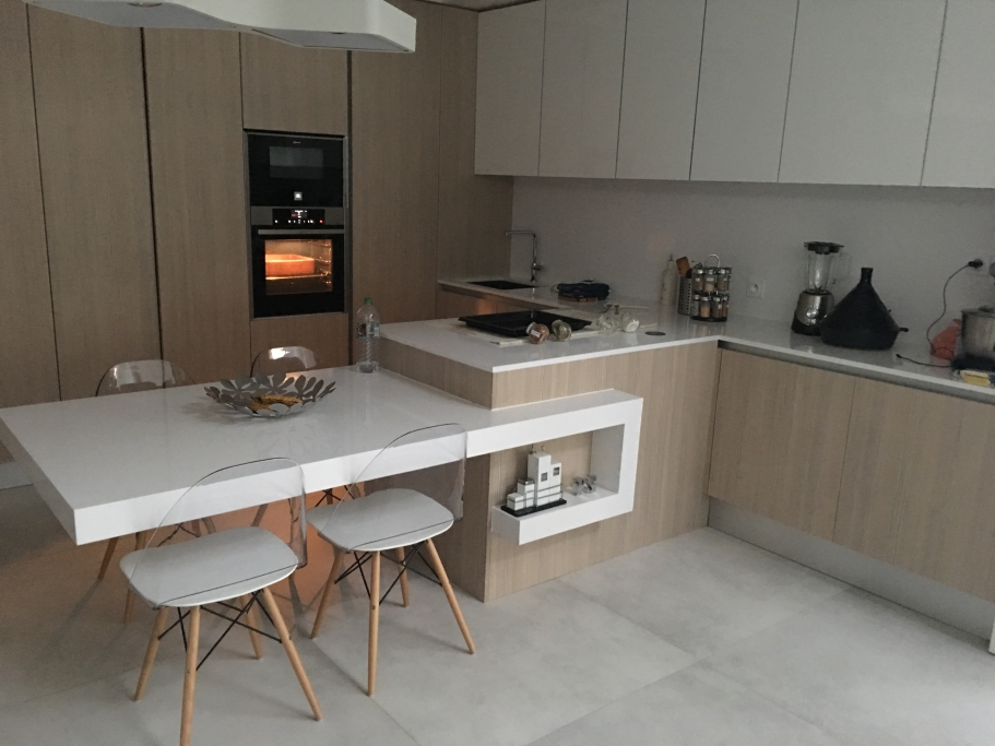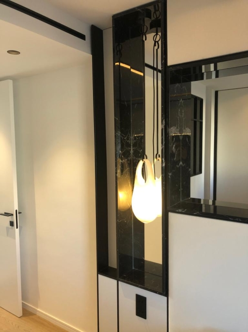Loft à Paris avec Fourniture et Application du Service IS en Travertin avec design usiné et Lavabo modèle CUBE byannopei ; EST commun avec des murs en Blue Marble Lagoon paginé et un lavabo modèle PURE byannopei en quartz extra blanc; IS Suite en Nero Marquina et Extra White Quartz et avec base de douche modèle PURE byannopei et lavabo PURE R byannopei ; Cuisine complète et dessus en quartz blanc, y compris la conception.