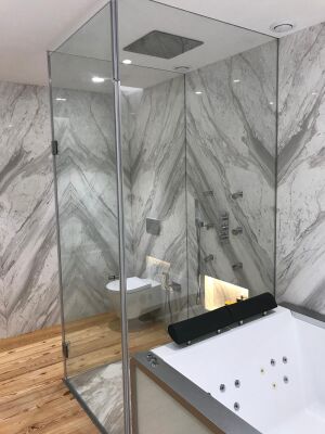 Supply of Pink Portogallo Marble to cover the walls of the bathroom in the suite and supply of gray Compact Material washbasin for both.