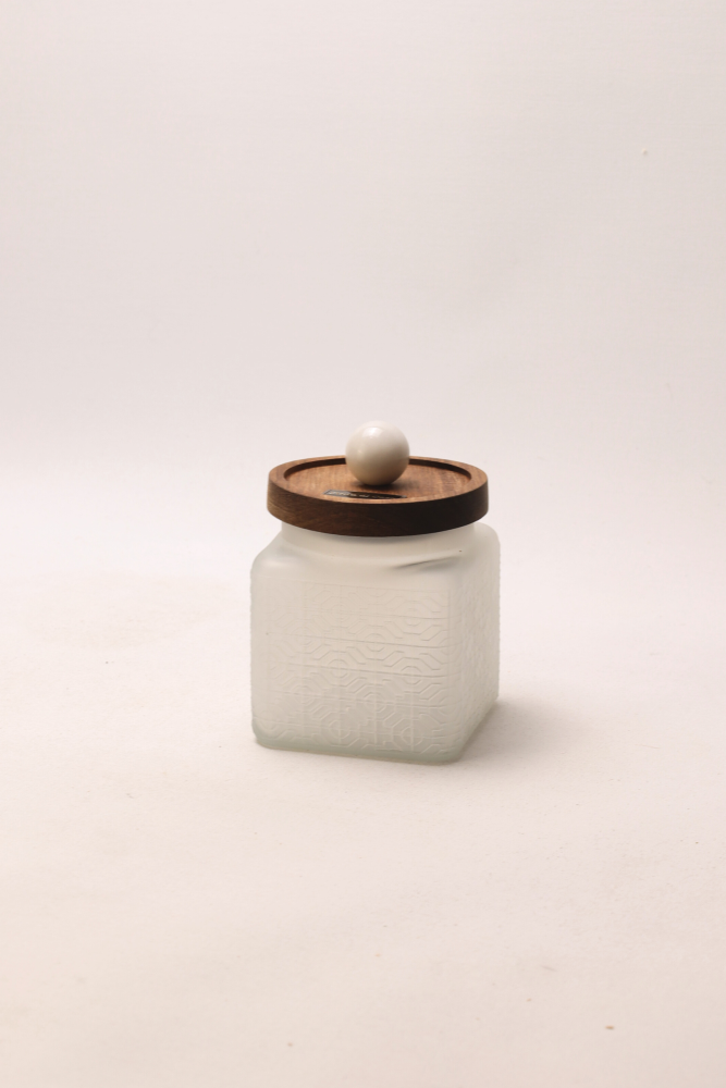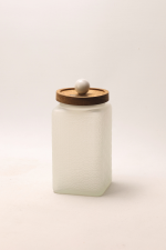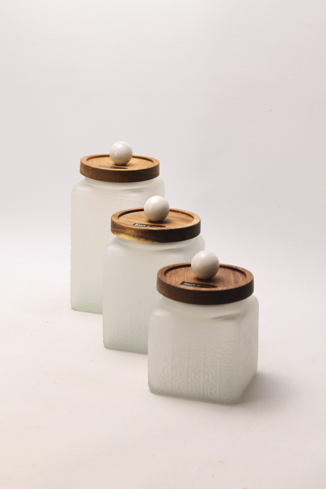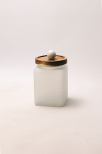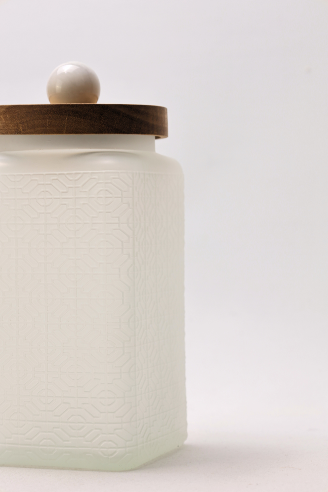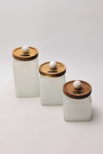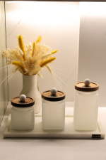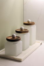 Each white glass container is finished with a practical and functional acacia wood lid. The distinctive feature is the decorative appliqué in the shape of a marble sphere made from Volakas marble, adding sophistication and exclusivity to each piece.