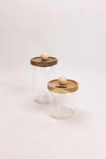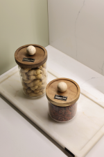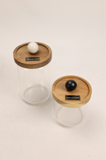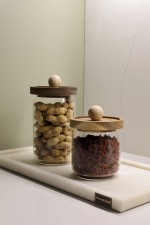 Each jar features a hermetic lid made of acacia wood, ensuring functionality, while the decorative appliqué in natural stone adds exclusivity and timeless elegance.