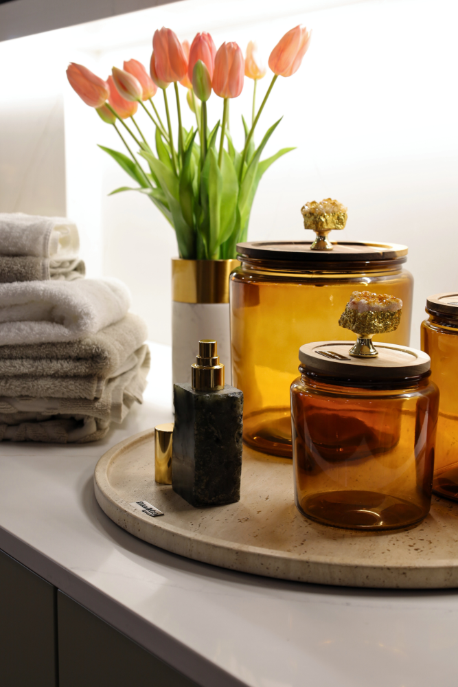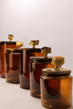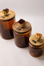Chaque récipient est doté d’un couvercle hermétique en bois, soigneusement travaillé, et orné d’un appliqué décoratif en pierre naturelle, rendant chaque pièce unique et exceptionnelle.