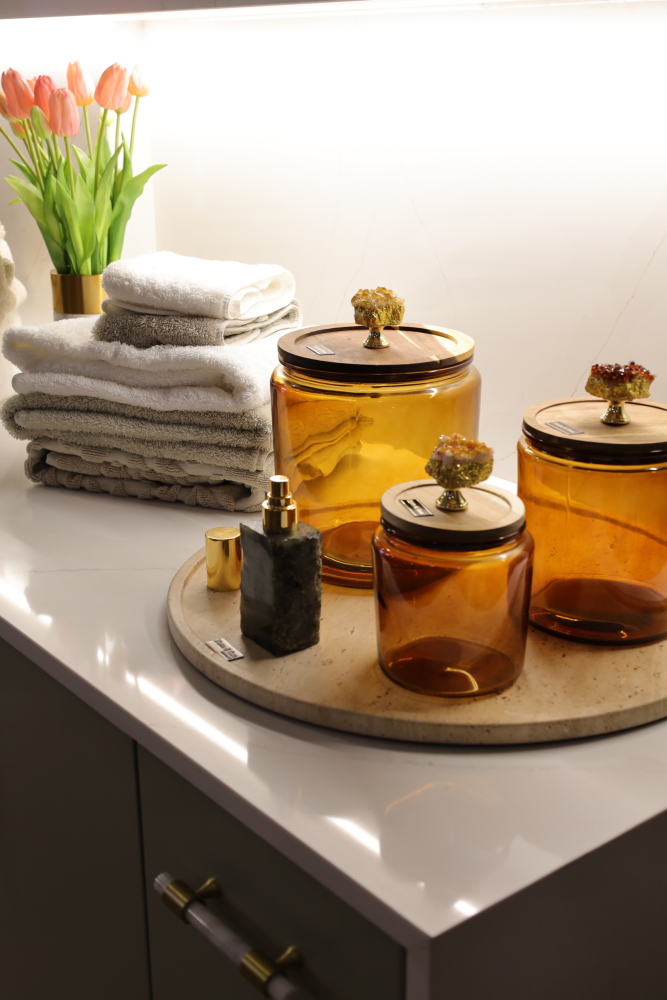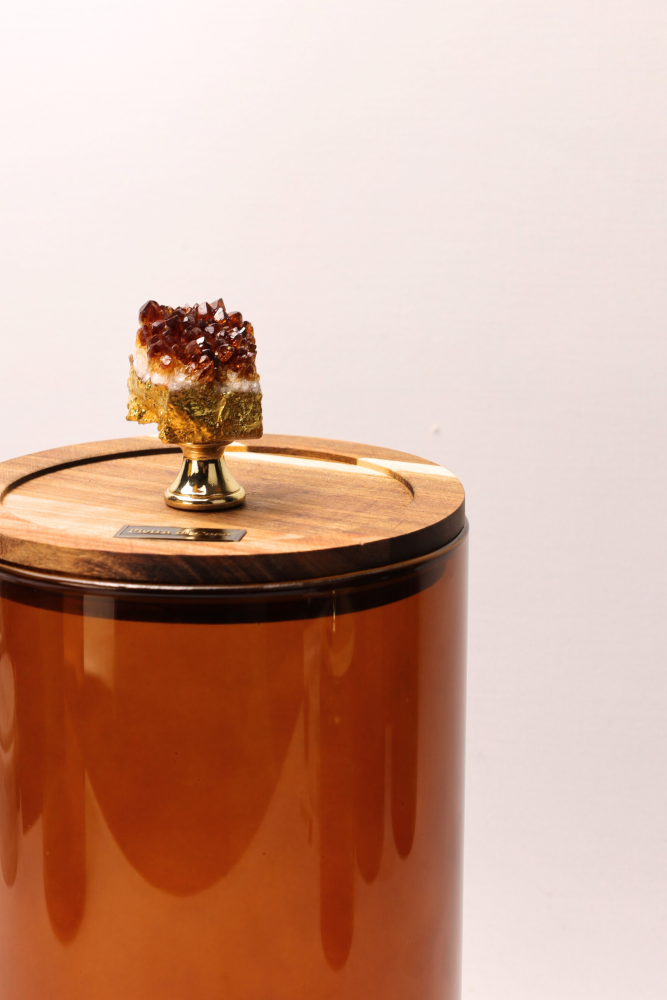 Le ensemble OLENA combine la beauté naturelle du verre ambré avec la sophistication du bois d’acacia et l’unicité du géode de citrine.
